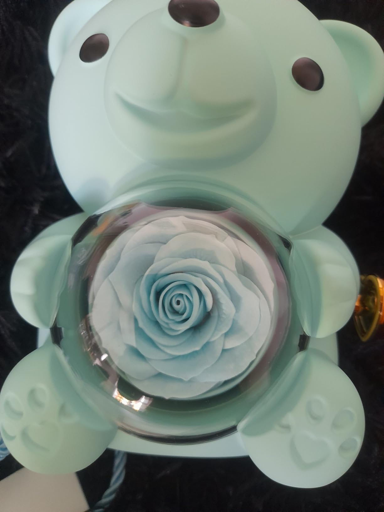 Bonjour j'ai commandé se cadeau pour la fête des mère à ma femme elle a était vraiment très contente le produit et de bonne qualité il i a une petite molette sur le coter pour faire tourner la boule que l'ours porte d'un côté ses une rose et de l'autre il i à un très jolie collier je le recommande sans hésiter